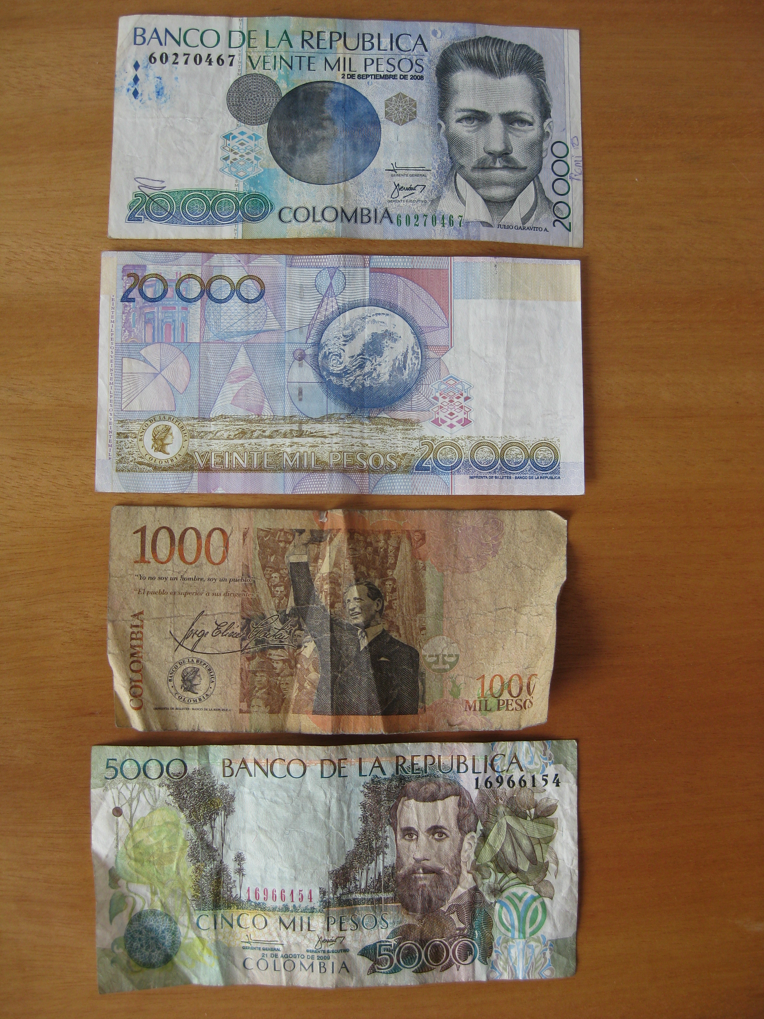$20,000 peso bill, back and front. $1,000 peso bill. $5,000 peso bill. My niece recently gave me a lesson in how to tell if bills are counterfeit.