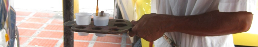 Also, I’m unfamiliar with this coffee serving equipment that the author apparently saw – something that reminded him of the thing worn by people who exterminate bugs. Sounds cool, but I’ve never seen that here. In Barranquilla, the coffee vendors use thermoses, though they do have these super cool wooden paddles where they can place multiple cups of different sizes in order to pour and serve numerous cups of coffee at once. In Rodadero, near Santa Marta, the thermoses have those push-down buttons on top that make the coffee come out, whereas Barranquilla has regular screw-on lids.
