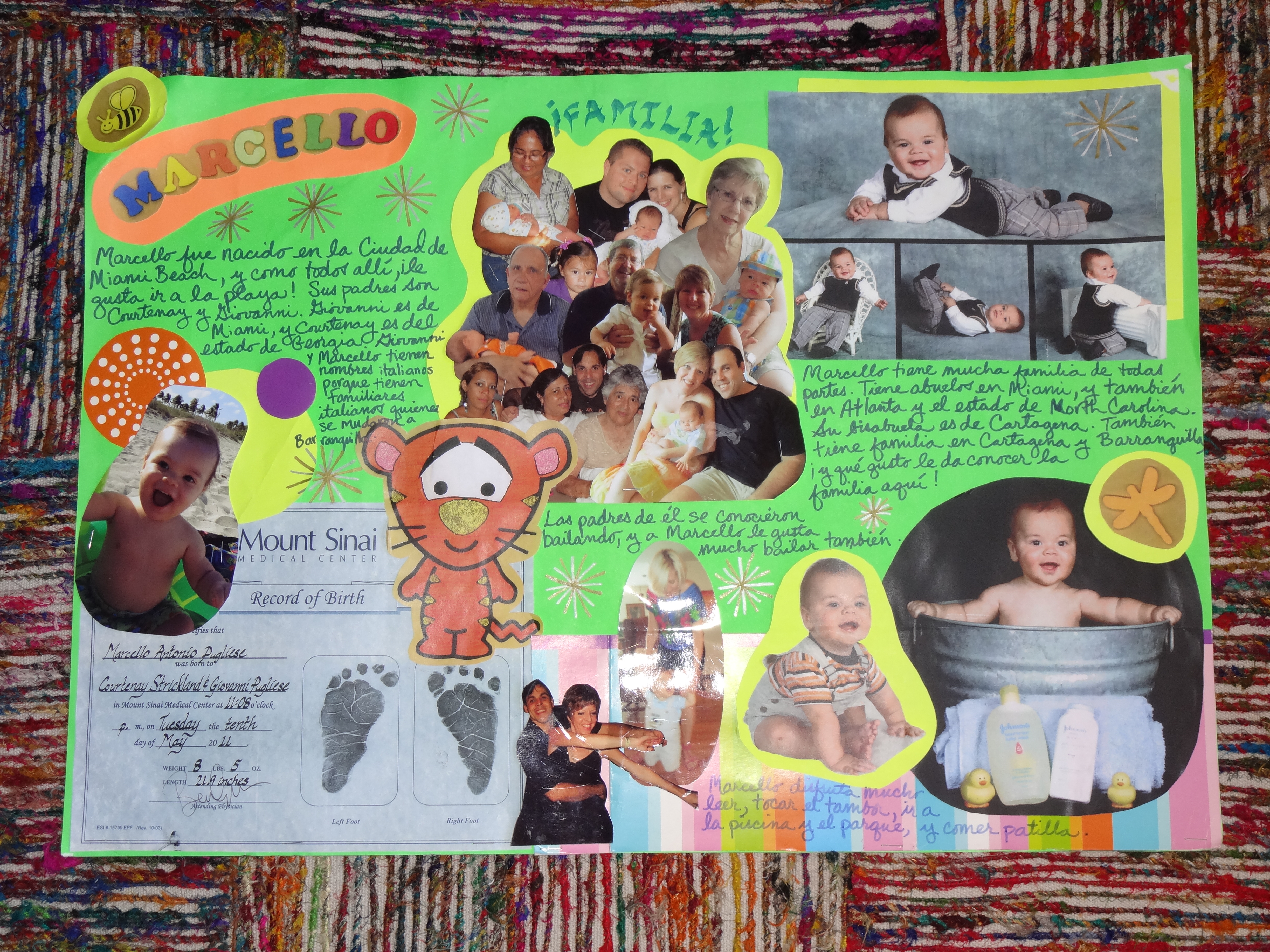 While I didn’t have to put together a Power Point (oh, that would have been so much easier), I did have to literally cut and paste photos and apply them collage-style onto poster board. During this same week, I also had to add five pages about Marcello to the school’s official scrapbook.  This was highly intimidating given that other parents had seriously bling-ed out their pages. Honestly, they stopped just short of using a BeDazzler. All this was greatly complicated by the fact that we had just moved to Barranquilla, and I didn’t know where to buy Scotch tape, much less ribbon and glitter.