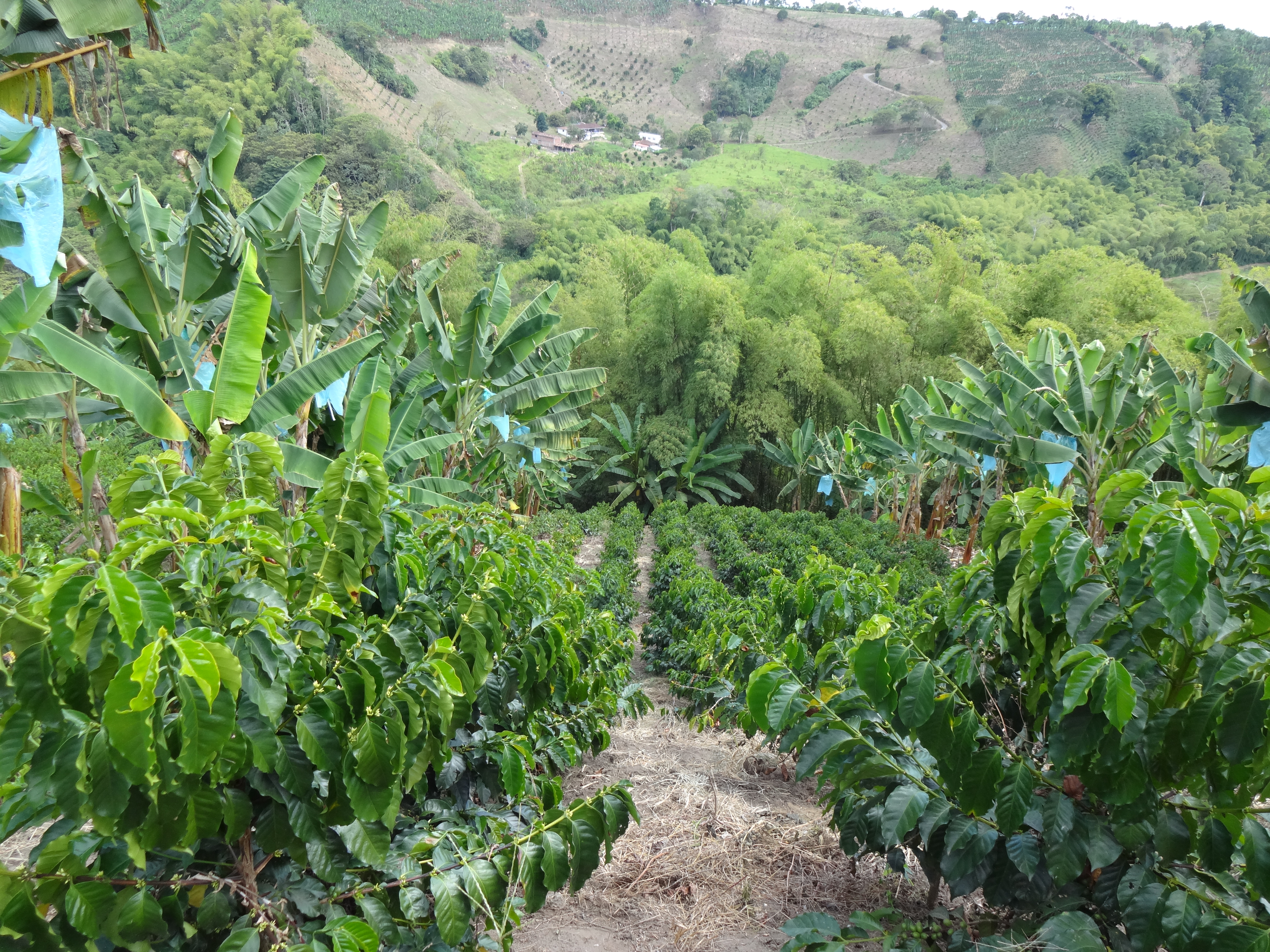 Coffee plants, with plantain trees in the background (the bananas are covered with blue bags to protect them from birds).