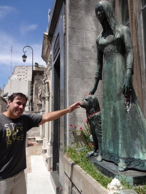 In a traditional gesture for good luck, Gio rubs the nose of the dog that’s part of a sculpture built by a father for his lost daughter.