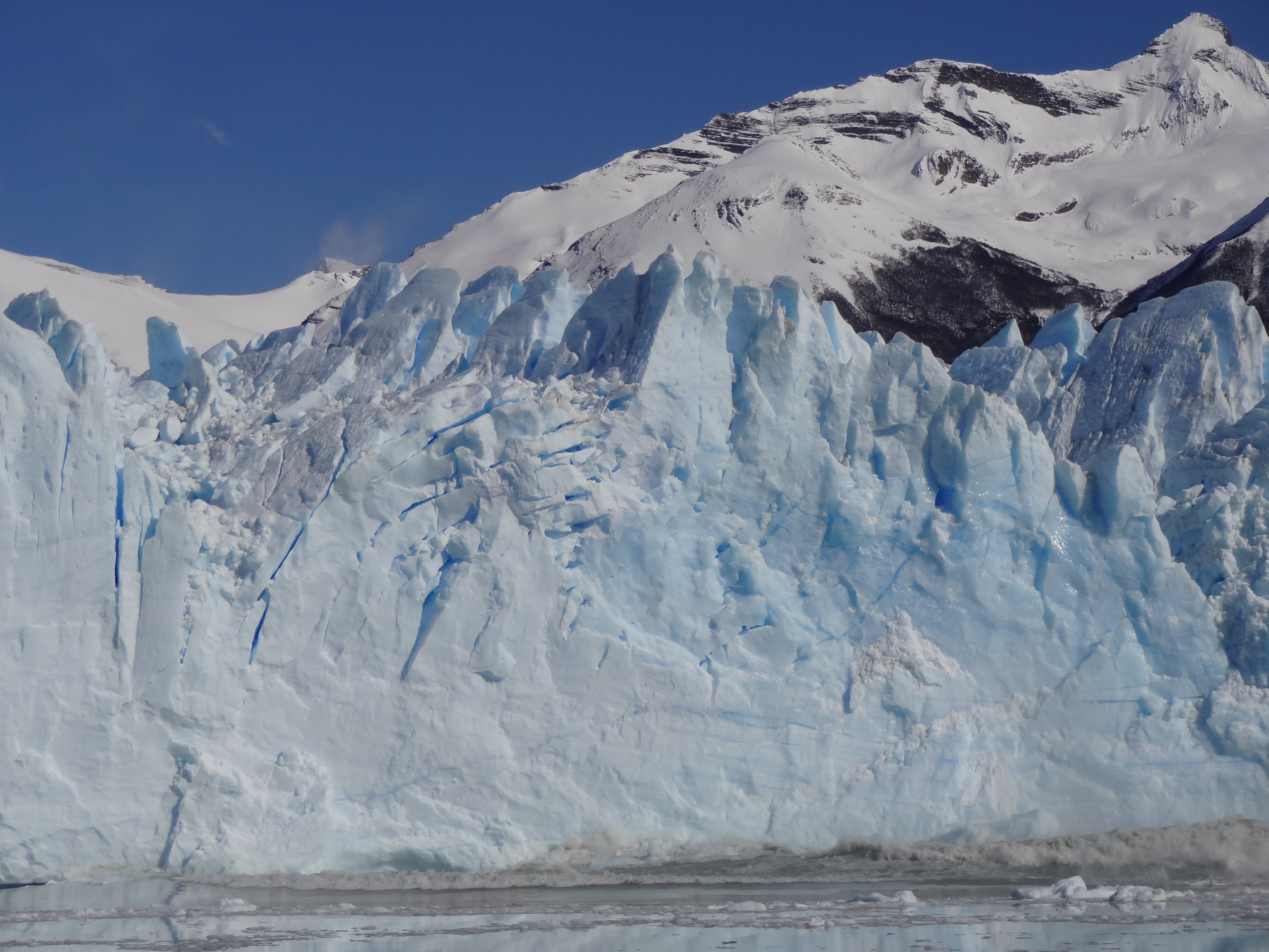 Areas where ice has recently calved shimmer like a fresh wound.